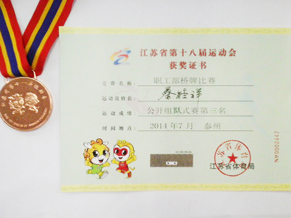 7月20-26日,江蘇省第十八屆運動會職工部橋牌比賽在泰州市舉行,應蘇州市總工會邀請,我公司職工蔡桂祥代表蘇州市參賽。經過激烈角逐,蘇州代表隊獲得了團體第三名的好成績,蔡桂祥個…